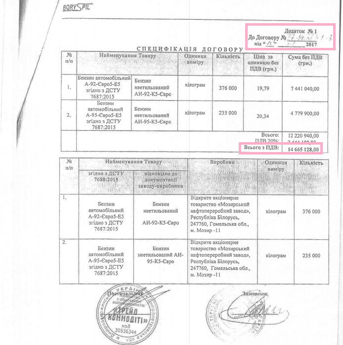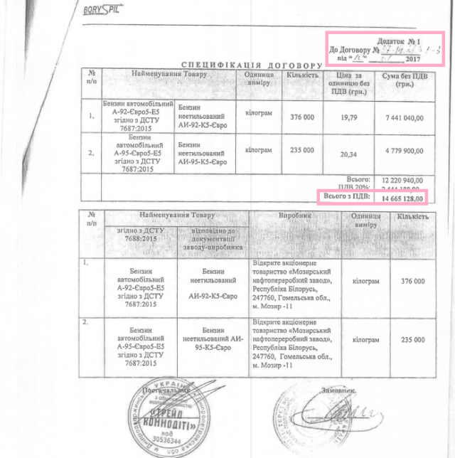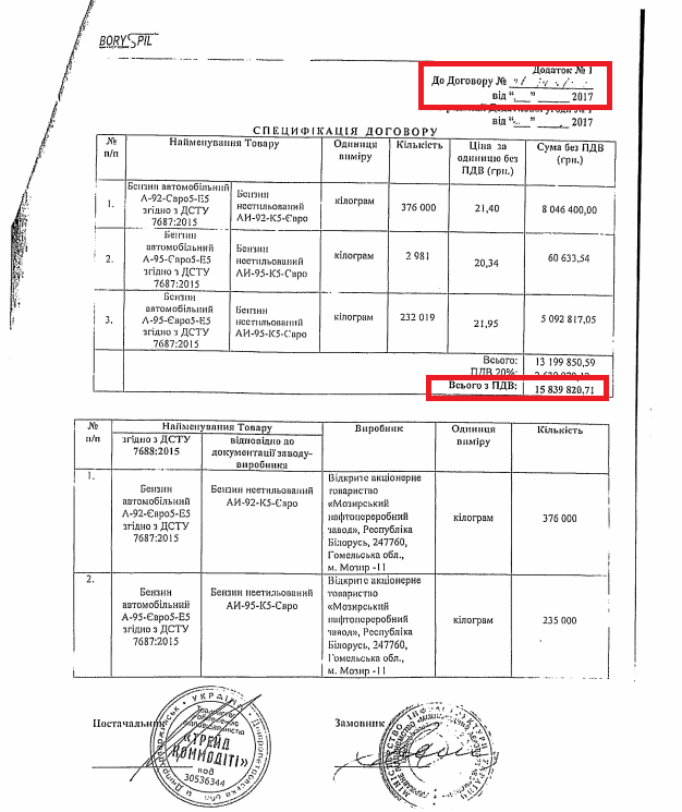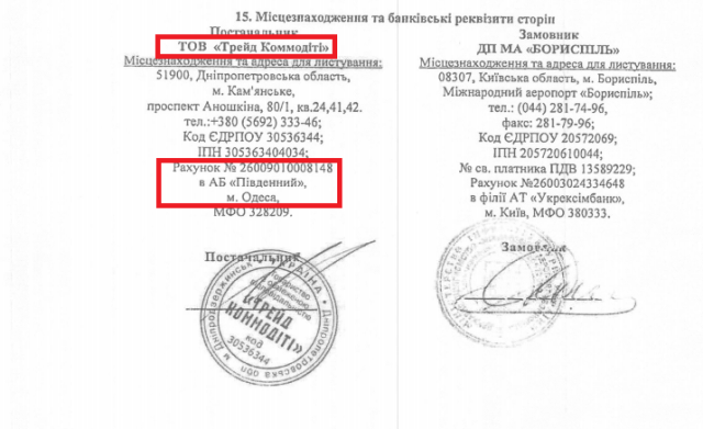 Так, в кінці 2016 року «Трейд Коммодіті» виграв тендер аеропорта «Бориспіль» на постачання палива протягом 2017 року. Компанія запропонувала найнижчу ціну, порівняно з іншими - 14,66 млн гривень за партію в 611 тонн палива, і підписала контракт в січні цього року. Однак в результаті підписання додаткової угоди вже через місяць ціна контракту виросла до 15,84 млн гривень, або майже на 8%.Те, що відбулося можна вважати видимою частиною айсберга, що відображає схему роботи «Трейд Коммодіті». На відкритих аукціонах ця компанія зі статутним капіталом 7,4 тис. гривень, оформлена на якогось Вадима Майко з Кам'янського, перемагає в тендерах, пропонуючи ціну нижчу за ринкову. А потім підписує додаткові угоди, в результаті яких прайси значно збільшуються (за законом, держзамовник і підрядник мають право узгодити збільшення ціни не більше, ніж на 10% у разі форс-мажору, наприклад, зростання цін на ринку або збільшення ставок акцизу на паливо). У випадку з компанією з Кам'янського ця тактика з минулого року працює без будь-яких проблем.