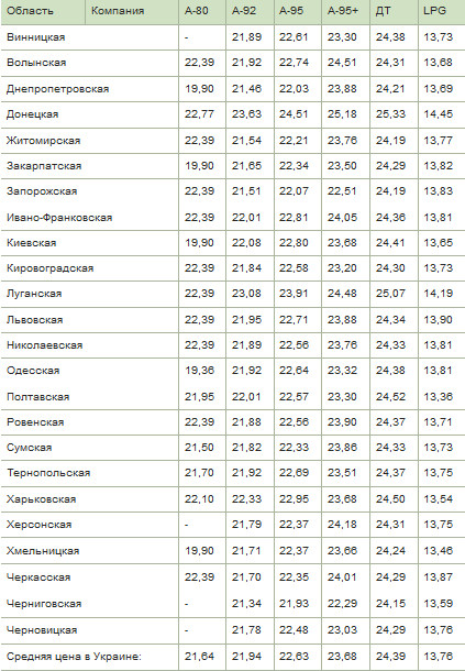 Максимальна ціна А-95 – у Донецькій області – 24,51 гривні за літр; мінімальна у Чернігівській області – 21,93 гривні за літр.