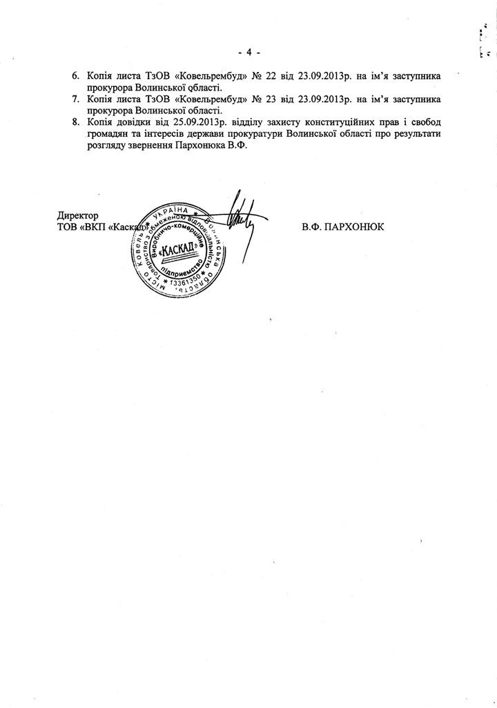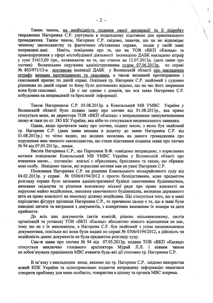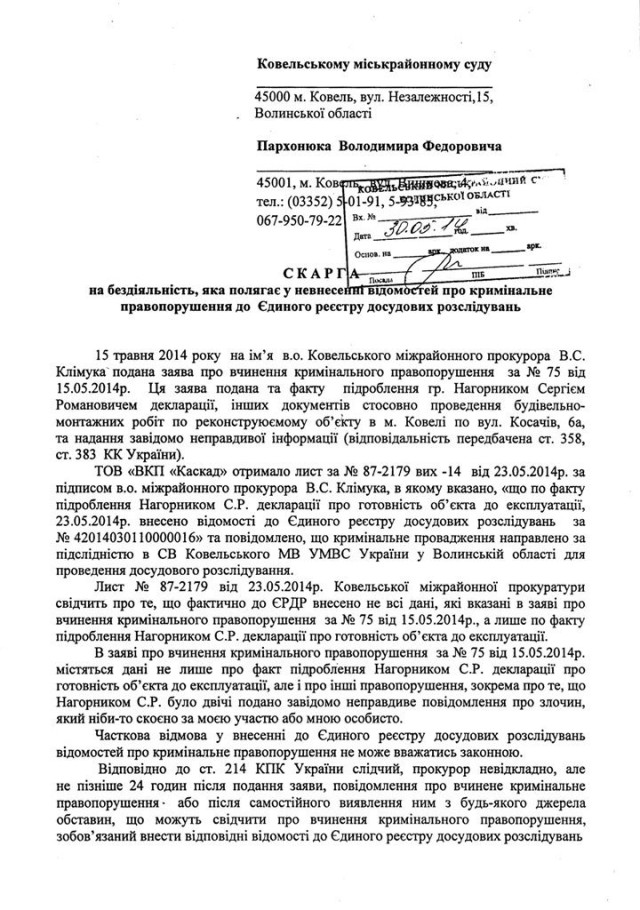 Володимир Пархонюк сподівався, що останнім рятівним колом стане Ковельська міжкрайонна прокуратура, куди й скерував заяву про злочин. Згодом отримав лист за підписом виконувача обов’язків прокурора Віктора Клімука, де сказано: «по факту підроблення Нагорником С.Р. декларації про готовність об’єкта до експлуатації 23 травня внесено відомості до Єдиного реєстру досудових розслідувань». Кримінальне провадження направлено за підслідністю з прокуратури в слідче відділення Ковельського міського відділу внутрішніх справ.