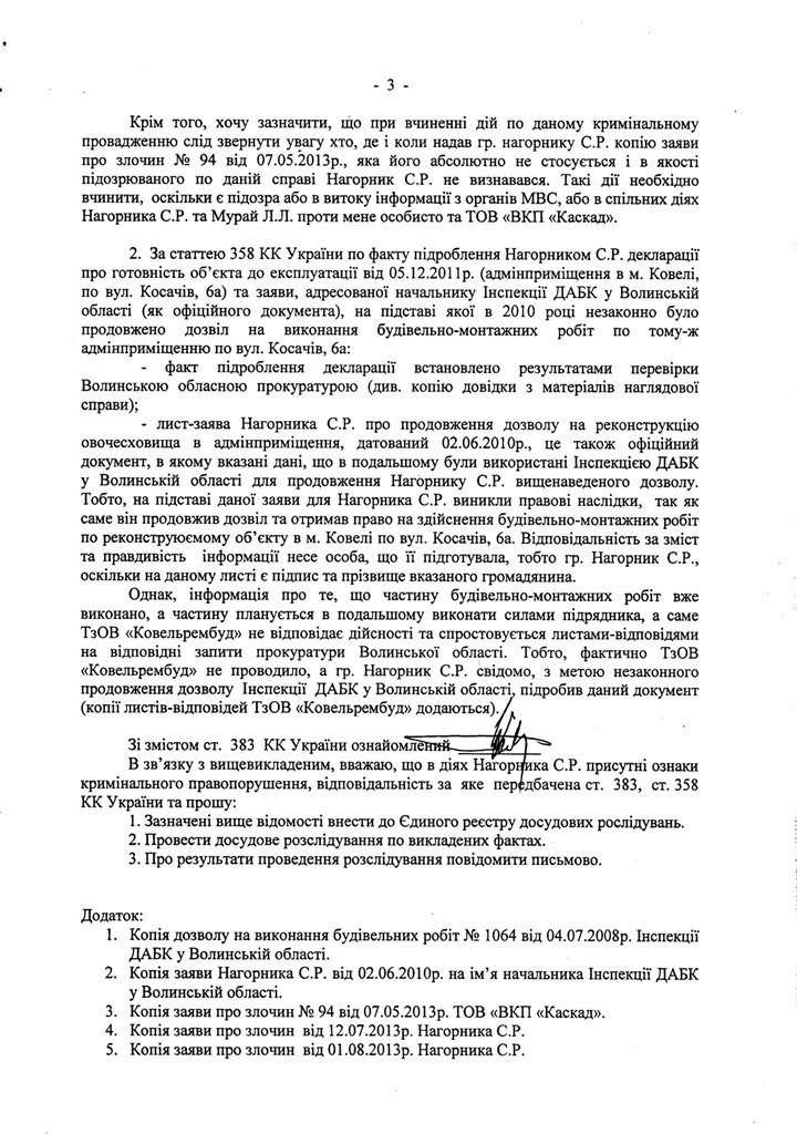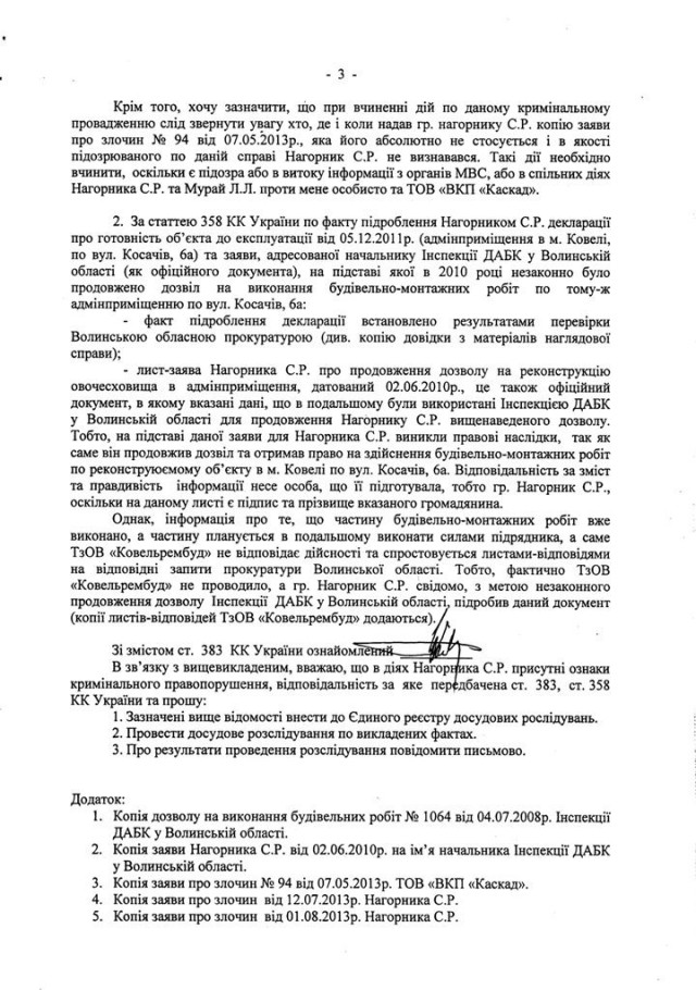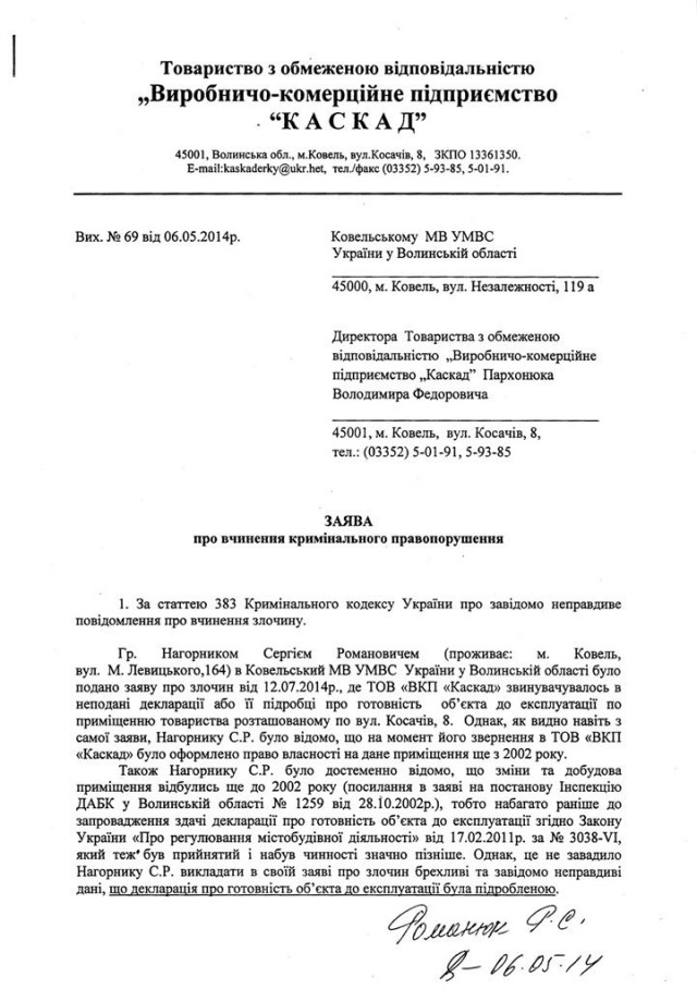 Справа в тому, що 6 травня цього року бізнесменом було подано до ковельської міліції заяву про вчинення кримінальних правопорушень, відповідальність за які передбачена санкціями статей 358, 383 КК України, а саме по факту підроблення ковельчанином Сергієм Нагорником декларації, інших документів та завідомо неправдивого повідомлення про злочин. Заяву подано у відповідності до норм чинного законодавства, а факти порушень підтверджено відповідними документами. Нагадаємо, війна між двома підприємцями триває вже досить довго, а розгорілась через добудову приміщення одного з підприємців.