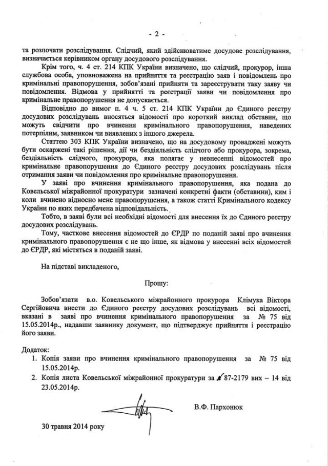 Директор ковельського ТзОВ «Каскад», депутат Ковельської районної ради Володимир Пархонюк звернувся до суду із скаргою, аби відстояти своє законне право, передбачене новим, недавно прийнятим Кримінально-процесуальним кодексом України, щодо внесення відомостей про кримінальне правопорушення до Єдиного реєстру досудових розслідувань.