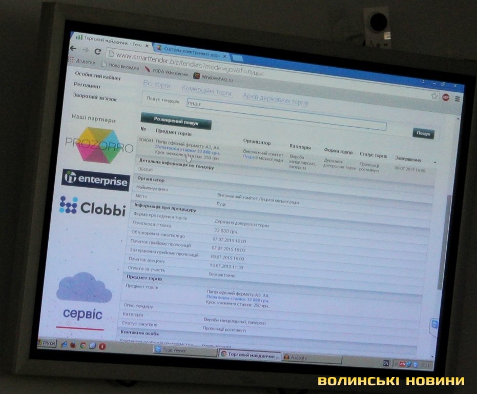 Як пояснив перший заступник міського голови Тарас Яковлев, ще декілька років тому в Україні громадські організації ініціювали електронну систему закупівель. Її почали пілотно впроваджувати у державних установах та органах місцевого самоврядування. Луцька міська рада першою виявила бажання купувати товари та послуги через систему електронних закупівель. Відтепер виконавчі органи міськради зобов’язані всі закупівлі здійснювати через електронну систему «смарт тендер». Термін подачі заявок визначає контрагент, вказують також технічні характеристики товару. Як приклад, Тарас Яковлев продемонстрував заявку на придбання паперу на суму 32800 гривень, на яке зголосилося чотири суб’єкти господарювання.