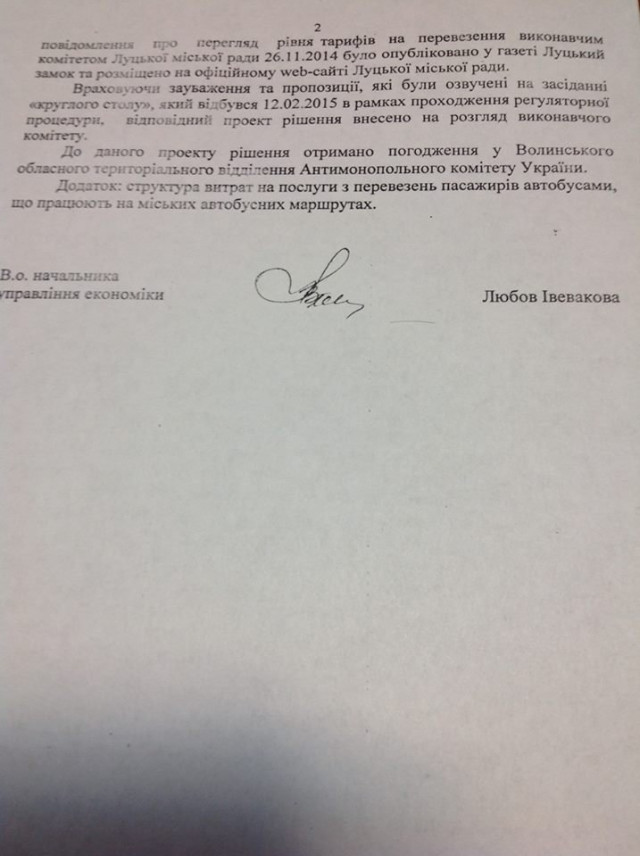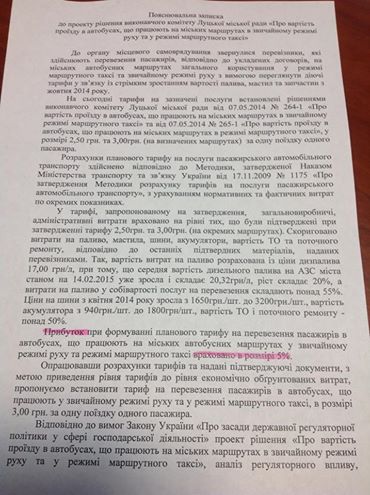 "У тарифі, запропонованому на затвердження, загальновиробничі, адміністративні витрати враховано на рівні тих, що були підтверджені при затвердженні тарифу 2,50 грн та 3,00 грн (на окремих маршрутах). Скориговано витрати на паливо, мастила, шини, акумулятори, вартість ВО та поточного ремонту, відповідно до останніх підтвердих матеріалів, наданих перевізниками. Так, вартість витрат на паливо розрахована із ціни дизпалива 17,00 грн/л, при тому, що середня вартість дизельного палива на ВЗС міста за станом на 14.02.15 уже зросла та складає 20,32 грн/л, ріст складає 20%, а витрати на паливо у собівартості послуг на перевезення складає 55 %. Ціни на шини з квітня 2014 року зросли з 1650 грн/шт до 3200 грн/шт, вартість акумулятора з 940 грн/шт до 1800 грн/шт, вартість ТО і поточного ремонту - 50%", - йдеться у документі.