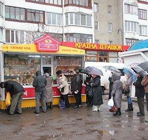 — Нас двоє і четверо дітей, — каже. — Троє хлопців. Буханки хліба на день нам мало. Після того як хліб подорожчав, ходжу тільки сюди. Тут він дешевший — 2 гривні 75 копійок. За буханку свіжого треба віддати більш як п’ять. А в кіоску від теремнівського заводу я за таку ціну дві куплю. Трохи зекономлю на інші продукти.