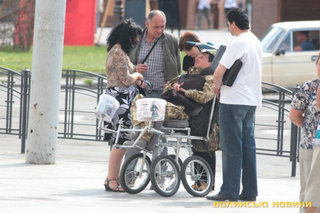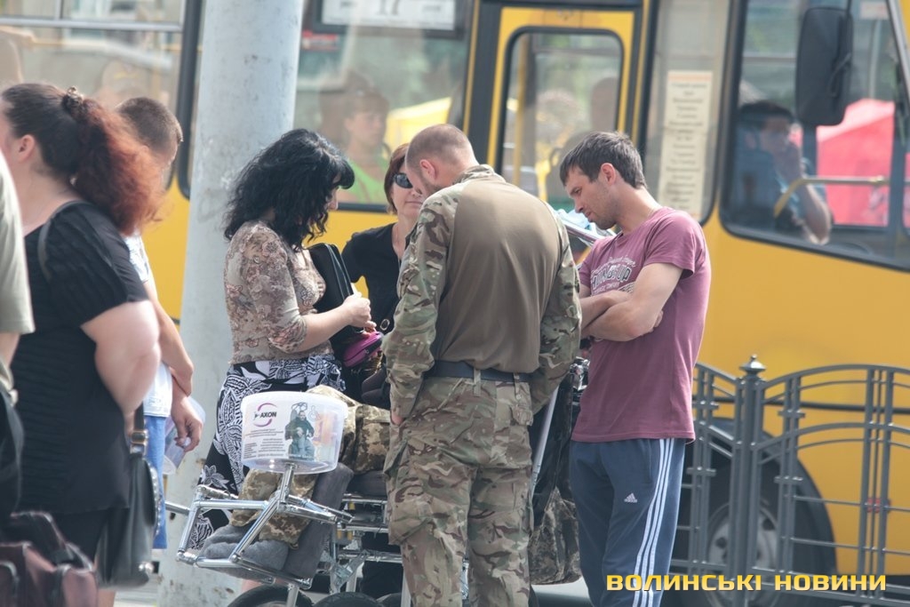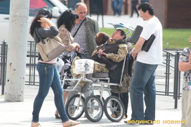 У центрі Луцька інвалід з дитинства разом із поплічниками, одягнувшись у військову форму, просив гроші. На запитання, хто він і що з ним трапилось, останній відповідав кожен раз по-іншому. Так, спочатку він називав себе учасником АТО, який втратив повносправність після поранення, згодом казав, що збирає гроші для бійців-побратимів, а, насамкінець, заявив, буцімто вкладе зароблені кошти на розробку нової моделі інвалідного візочка.