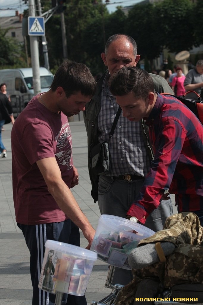 Таку картину лучани та гості міста мали можливість спостерігати учора, 17 червня, біля центрального універмагу.Жалісливі перехожі, яким одразу кидався у вічі камуфляжний одяг, не шкодували для псевдобійця ні грошей, ні теплих слів підтримки.Однак, зважаючи на те, що якось дивно і неправдоподібно виглядала ця історія, та й інвалід, схоже, був таким із дитинства, луцькі волонтери поспішили повідомити про інцидент правоохоронні органи. Попередньо на місце події прибули активісти.Перед тим, як віддати «гастролерів» у руки міліції, вони пересвідчились, що «заробітчани», як виявилось, із Нової Каховки Херсонської області, не мають при собі відповідних документів. Натомість, на вимогу їх показати, гордо демонстрували документ про створення ГО «Аксон».Але яким чином ця організація має стосунок до законного збору коштів у Луцьку – ні слова.
