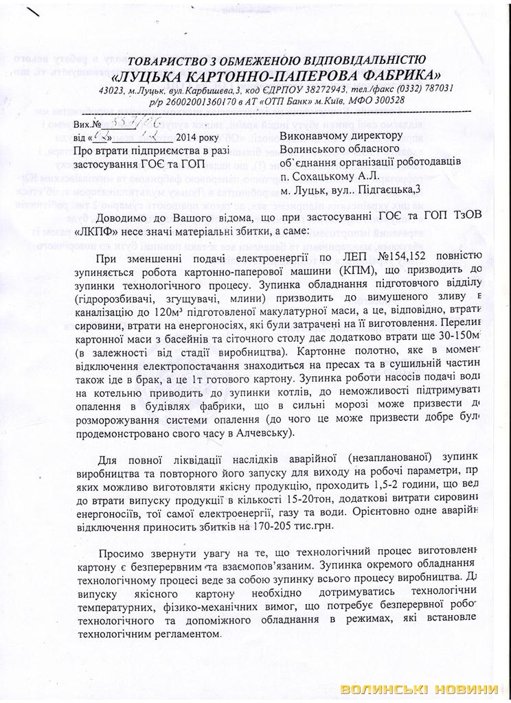 Підприємство не раз писало листи до «Волиньобленерго», обґрунтовуючи обсяги втрат не лише для підприємства, а й для національної економіки.На це відповідають, що з розумінням ставляться до всіх проблем користувачів, але в країні – складне становище і є графіки відключення.Керівництво фабрики звернулося й до обласного об’єднання організацій роботодавців. Як результат – від Волині на адресу Федерації роботодавців України надійшло звернення. Виконавчий директор Волинської обласної організації роботодавців Анастасій Сохацький розповідає: у листі йдеться про те, що волинські підприємства терплять значні збитки від відключень.