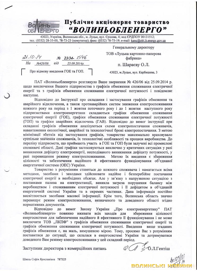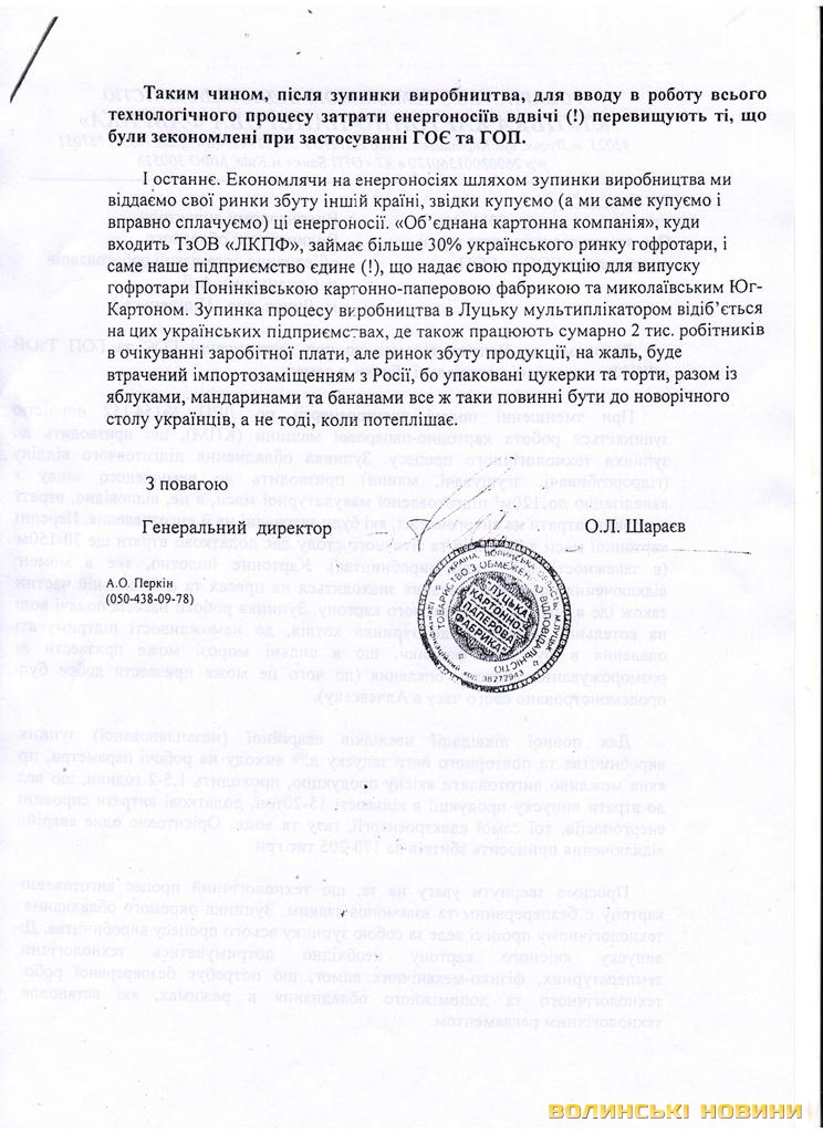 «Так, справді, картонно-паперова фабрика живиться від підстанції 330 кВ «Луцьк Північна». І одна з ліній (кабельна лінія 154) заведена під графік аварійних відключень. Те, що підприємство задіяне в графіках аварійних відключень, врегульоване договірними відносинами (договір про постачання електроенергії, додаток №4), і Луцька міська філія ПАТ «Волиньобленерго» розсилала повідомлення УСІМ промисловим споживачам Луцька. Разом з тим за проектом у картонно-паперової фабрики повинно бути 4 лінії. Відключали тільки одну - КЛ 154, у той час як КЛ 152 була в роботі. Дві інші лінії, які є в проекті - КЛ 153, КЛ 155, у них чомусь відключені. Тому якщо їхня схема не дороблена, то чого висловлювати претензії «Волиньобленерго»? Ми не несемо відповідальності за технічний стан та можливості їхньої роботи. Тому навіть при відключеній лінії 154, згадане підприємство мало живлення. Разом із ними одночасно відключалися Луцький домобудівельний комбінат та Єврохолдинг.., але від них ніяких нарікань не було», - каже він.