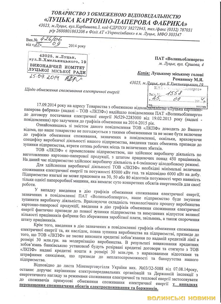 Заступник директора з технічних питань ПАТ «Волиньобленерго» Святослав Дмитроца коментуючи ситуацію, каже, що дійсно, картонно-паперова фабрика – з-поміж об’єктів, які є в графіках відключень.