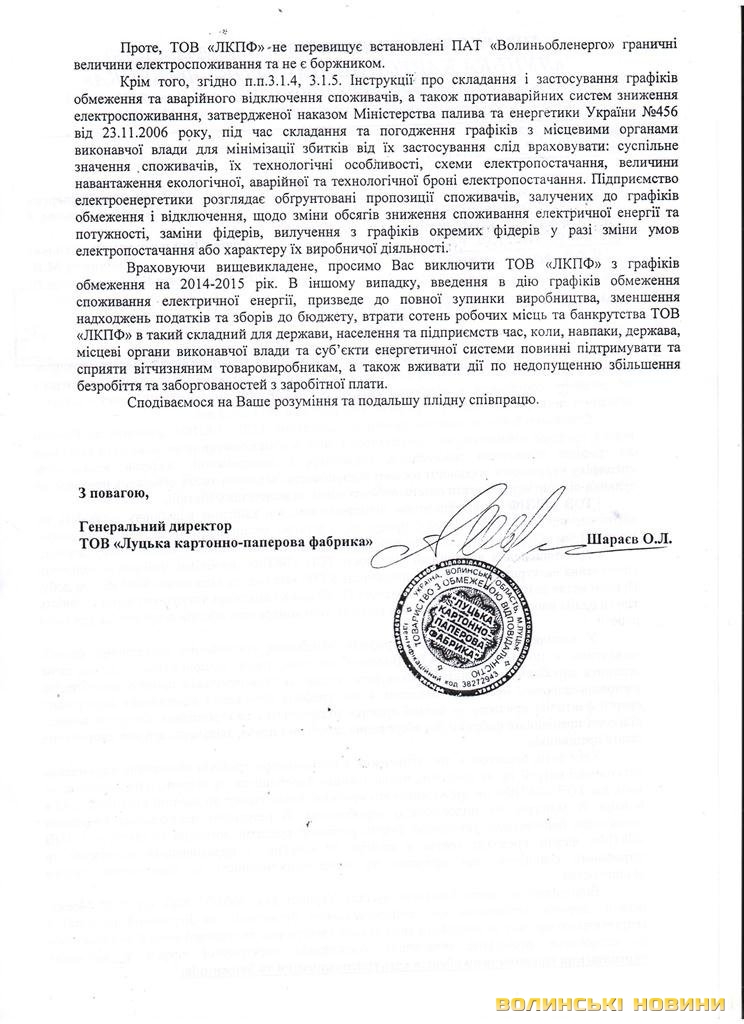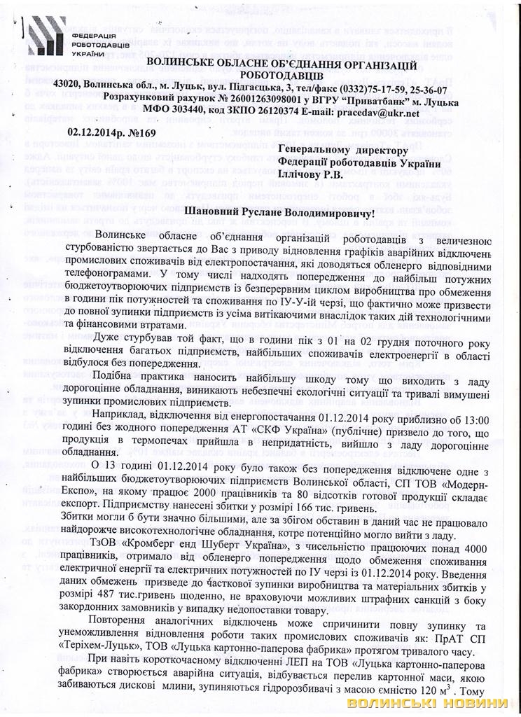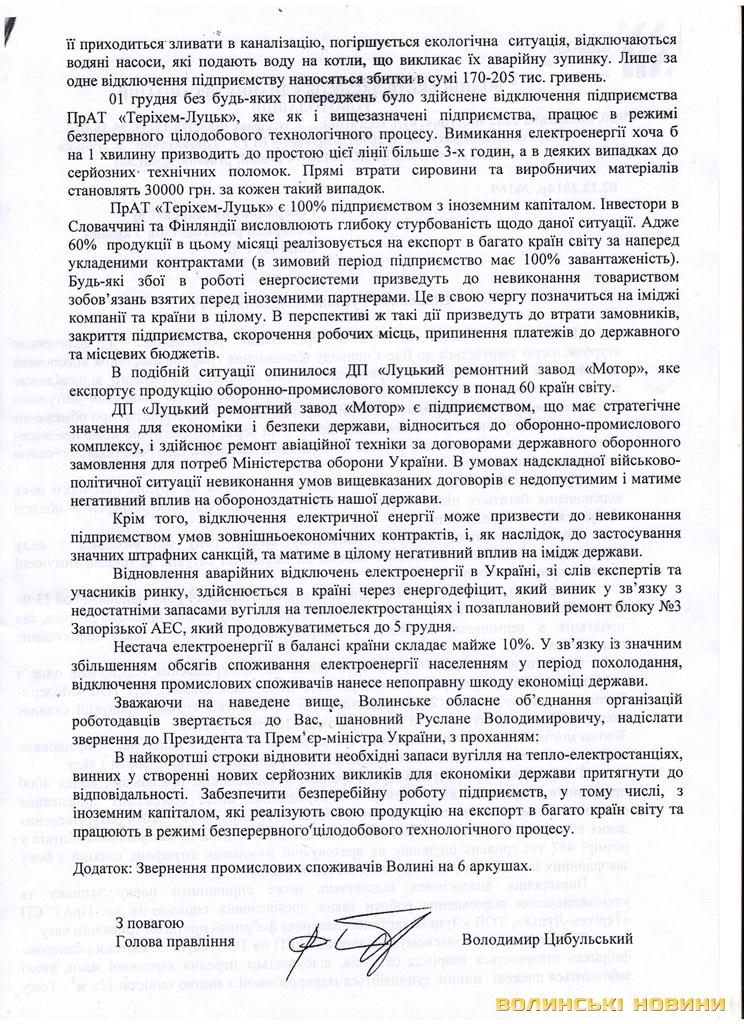 «Повторення аналогічних відключень може спричинити повну зупинку та унеможливлення відновлення роботи таких промислових споживачів як ПрАТ СП «Теріхем-Луцьк», ТОВ «Луцька картонно-паперова фабрика», - йдеться у листі.Відключення промислових споживачів нанесе непоправну шкоду економіці держави. Відтак, Федерацію просять звернутися до Президента та Прем’єр-Міністра України з проханням здійснити заходи задля забезпечення постачання електроенергії і безперебійної роботи підприємств.