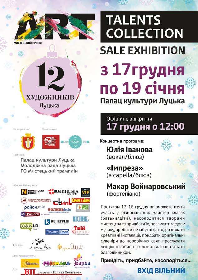 Протягом 17-18 грудня у рамках мистецького проекту «ART Talents collections/Sale-exhibition» лучани і гості Луцька можуть взяти участь у різноманітних безкоштовних майстер-класах (батьки/діти), послухати чудову музику, відвідати виставу творів мистецтва та придбати оригінальні сувеніри до новорічних свят.