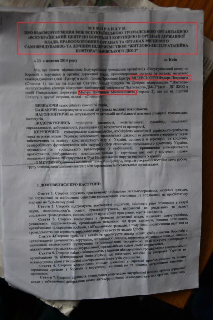 «Дочірнє підприємство «Житлово-експлуатаційна контора відкритого акціонерного товариства «Львівського ДБК-2»», далі – Замовник, в особі Генерального директор Мазура Любомира Миколайовича, що діє на підставі Меморандуму про взаєморозуміння між Всеукраїнською громадською організацією «Всеукраїнський центр по боротьбі з корупцією в органах державної влади, правоохоронних органах та органах місцевого самоврядування…», - йдеться у договорі.