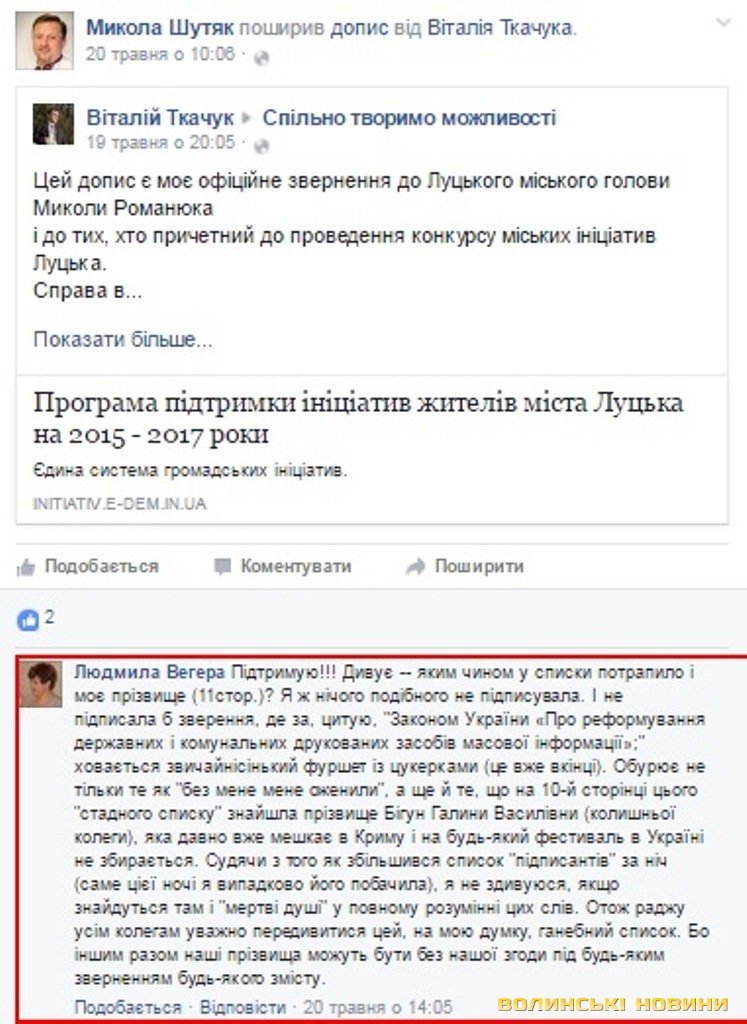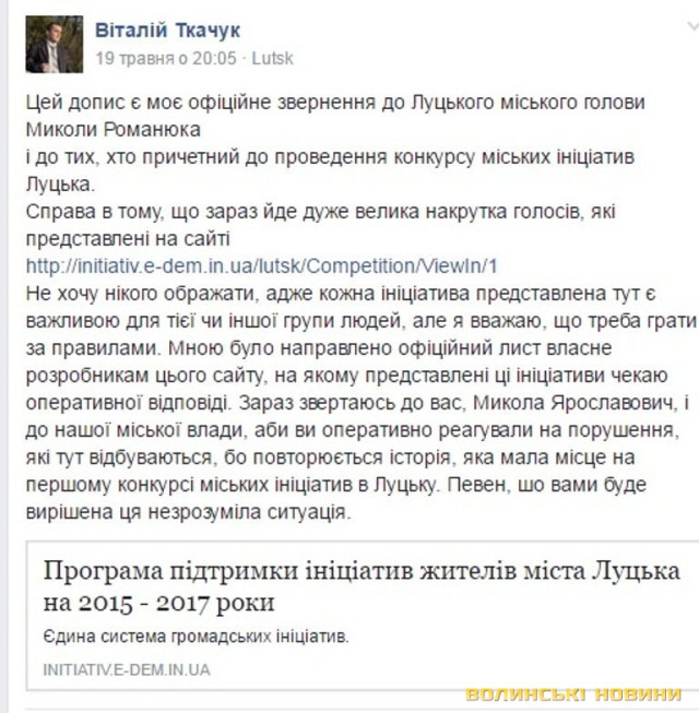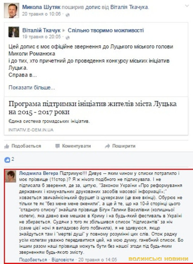 Про накручування голосів на своїй сторінці в мережі Фейсбук написав Віталій Ткачук .А під одним із репостів його дописує коментатор, театрознавець, волинська журналістка Людмила Вегера. Жінка заявляє, що з подивом знайшла своє прізвище серед підписантів ініціативи. Каже: вона цієї ініціативи не підписувала.Більш того, її обурює, що серед тих, хто підписав цю ініціативу, є дані Галини Бігун – колишньої працівниці ВОДТРК, яка переїхала до Криму, оформила російське громадянство, пише гнівні пости, подорожує до окупованого Луганська і публікує матеріал, у якому «няшну прокуроршу» Криму Наталію Поклонську називає «умница, красавица».Крім того, на сторінках з підписами, деякі імена з’являються по декілька разів. Очевидно, підписантам вельми хотілося перемоги, що всі свої голоси використовували заради однієї ініціативи.Коли стане відомо остаточний список переможців конкурсу громадських ініціатив ми запитали у першого заступника Луцького міського голови Тараса Яковлева. Він повідомив, що результати на сайті можуть побачити всі. А реалізація їх розпочнеться після відповідного підписання розпорядження міського голови. Про те, чи відбувалося накручування, чиновник каже, підтверджених фактів немає.