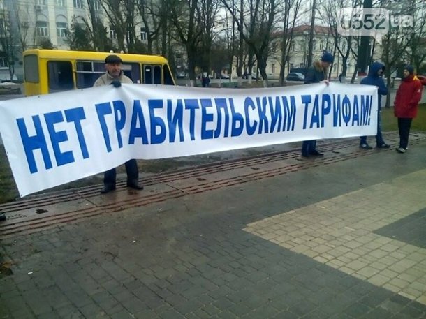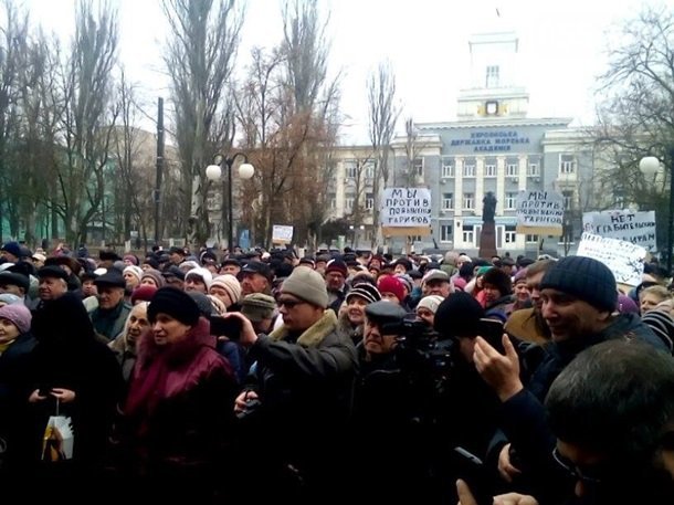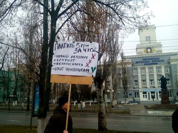 На вулиці протестувальники тримали плакати і великі банери «Ні грабіжницьким тарифам», «Ми проти підвищення тарифів», «Платити 5 грн. За що?».Варто додати, що в Херсоні маршрутники відмовляються возити пасажирів, вимагаючи підвищити тарифи.