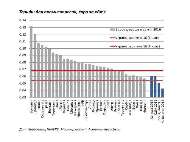 З його слів, тарифи для промислових споживачів в Україні на 10%-40% вищі, аніж у Росії і на 20%-70% аніж у Казахстані.