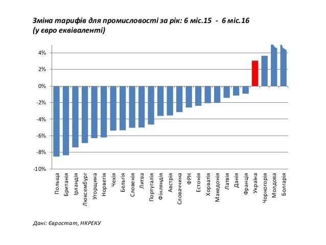 У той же час НКРЕ в своєму повідомленні про встановлені на жовтень тарифи зазначила, що діючі на сьогодні в країні ціни на е/е для промисловості на 54% нижче середньоєвропейського рівня загального тарифу для промисловості.