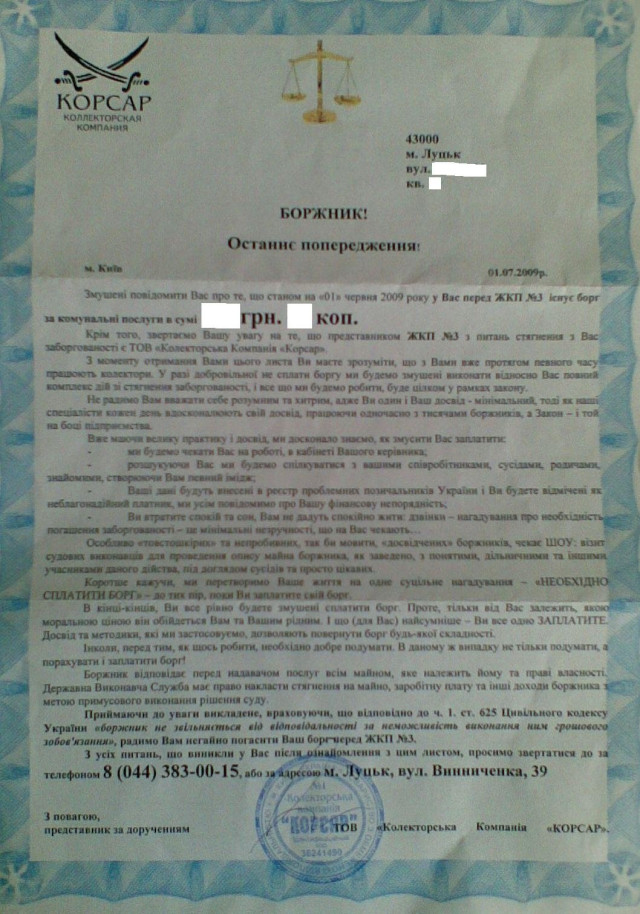 До редакції «ВН» звернулася мешканка Луцька, яка днями отримала уже звичного листа від колекторської компанії «Корсар». Очевидно, це не просто помилка, адже в її будинку подібного листа отримали мешканці як мінімум ще двох квартир. За інформацією колег-журналістів із інших ЗМІ, таких листів було розіслано кілька десятків.