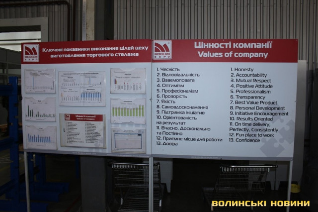 «Модерн-Експо» - одна з перших в Україні компаній, яка впроваджує ощадливе виробництво. Це така собі філософія роботи, яка базується на оптимізації всіх робочих процесів та зменшення втрат. Для прикладу, на виробництві усі цехи розташовані максимально близько один біля одного: метал гнуть, далі фарбують, потім пакують. Тут не потрібно витрачати багато часу та техніки для транспортування, усе можна зробити візком. Щодо робочого місця, то тут теж усе чітко впорядковано: інструменти підписані й кожен лежить на своєму спеціальному місці.
