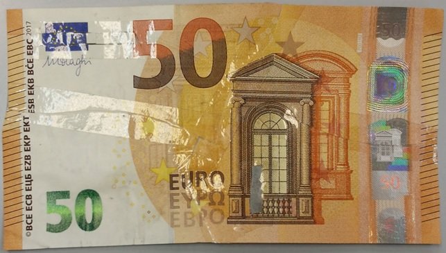 Кожна купюра складена з чотирьох частин справжніх купюр серії "Європа", введених в обіг 4 квітня 2017 року, які склеєні прозорою клейкою стрічкою.