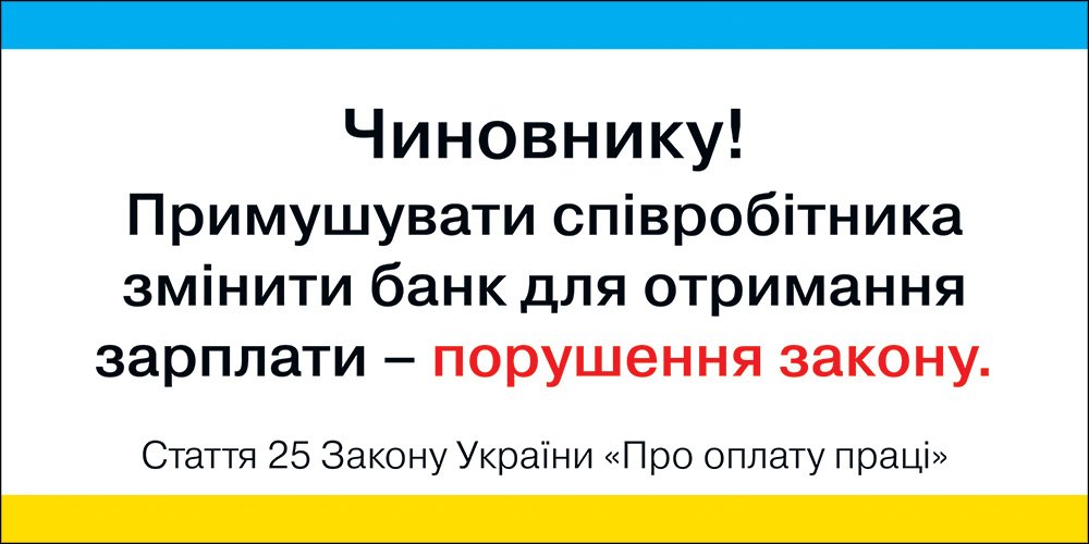 Насамперед, організатори акції звертають увагу на те, що Закон України «Про оплату праці» (ст.24 і ст.25) вказують, що кожна людина має право самостійно розпоряджатися своєю зарплатою і містять заборону кому б то не було заважати працівнику розпоряджатися зарплатою. Таким чином, адміністрація підприємства / організації під час вибору обслуговуючого банку повинна максимально врахувати інтереси своїх працівників. При цьому, порушення принципу добровільного вибору банку та передача персональних даних працівників банківським установам без відома людини являється кримінальним злочином.
