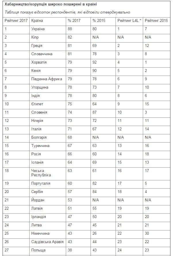 Як видно у таблиці, у 2015 році Україна у цьому рейтингу була сьомою за рівнем корупції.