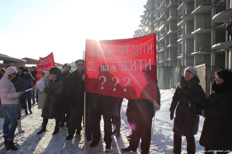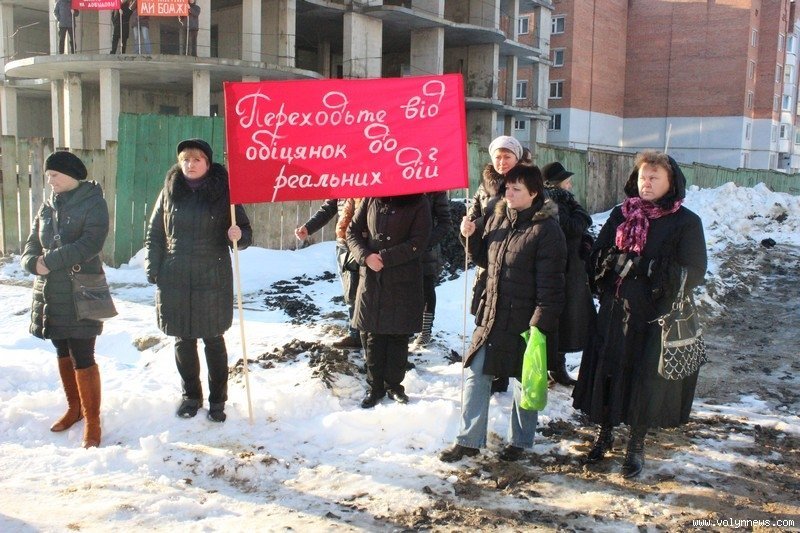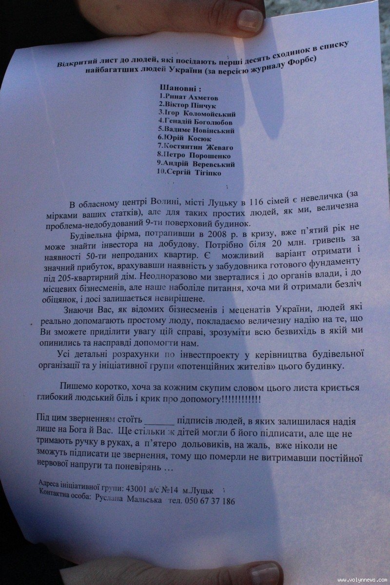 Приблизно півсотні дольових учасників будівництва багатоповерхівки на вулиці Липинського, 4 у Луцьку організували акцію, щоб просити найбагатших громадян України допомогти завершити зведення будівлі.
