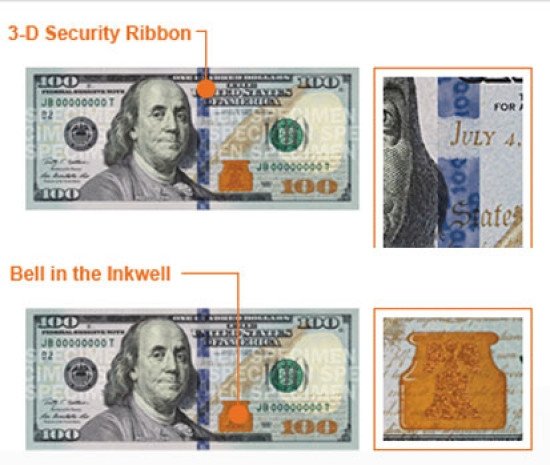 Оновлена 100-доларова банкнота, поряд із ефективними засобами захисту, які використані в старих купюрах, має два нові вдосконалені елементи захисту: тривимірну захисну стрічку та дзвоник у чорнильниці.