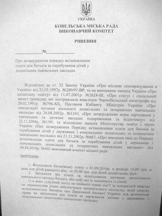 Батьки, діти яких відвідують Ковельські дошкільні навчальні заклади, з 1 вересня 2016 року платитимуть за своїх чад дещо більші суми грошей, ніж досі. Окрім цього, на відмінну від попередніх років, цьогоріч виконавчий комітет, на засіданні якого й приймалося дане рішення, встановив для різного віку дошкільнят різну батьківську плату, - інформує ПроКовель.