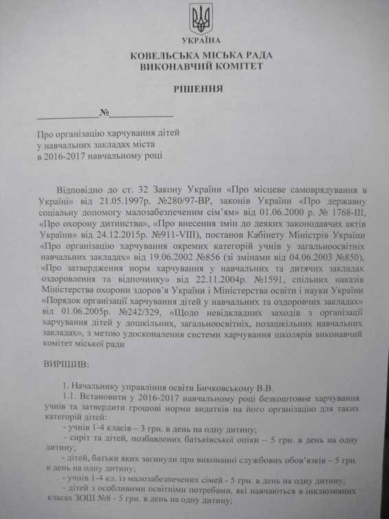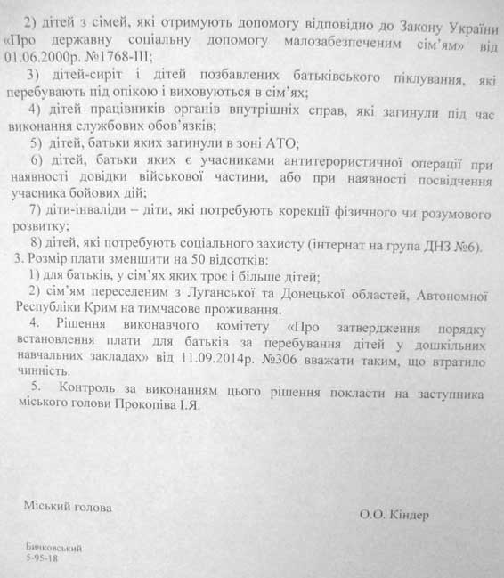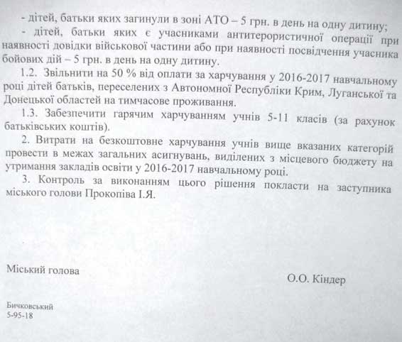 Також у міському управлінні освіти переглянули пільгові норми, за якими батьки, або особи, які їх замінюють із сімей, звільняються від плати. Залишили незмінною лише розмір пільги для батьків, у сім’ях яких виховується троє і більше дітей, а також сім’ям переселенців із Луганської та Донецької областей, Автономної Республіки Крим на тимчасове проживання. Вони отримуватимуть рахунки з 50-ти відсотковою знижкою від загального розміру нарахувань.Окремим рішенням встановлено й плату за харчування школярів у загальноосвітніх навчальних закладах міста. Так у новому навчальному році сніданок для учнів 1-4 класів становитиме 3 гривні в день на кожну дитину, для малозабезпечених сімей – 5 гривень, стільки ж нараховуватиметься плата за харчування сиріт та дітей, позбавлених батьківського піклування, батьки, яких загинули при виконанні службових обов’язків, у зоні АТО, батьки - учасники антитерористичної операції, дітям з особливими потребами. Всі ці витрати взяв на себе міський бюджет, тому для вищезазначених категорій дітей, гаряче харчування буде безкоштовним. А на половину від оплати за харчування звільнили дітей, батьки яких значаться як переселені з АР Крим, Луганської та Донецької областей.