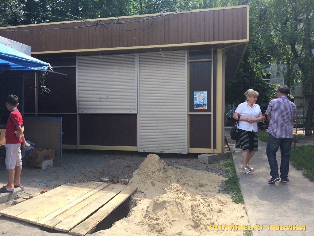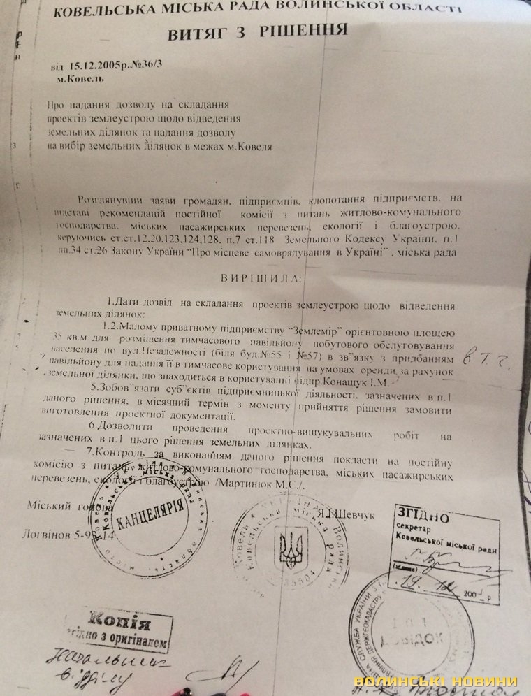 До слова, власником павільйону є керівник МПП «Землемір» Інна Конащук. Чоловік пані Інни – Юрій Конащук – працює радником-консультантом у Ковельського міського голови Олега Кіндера.