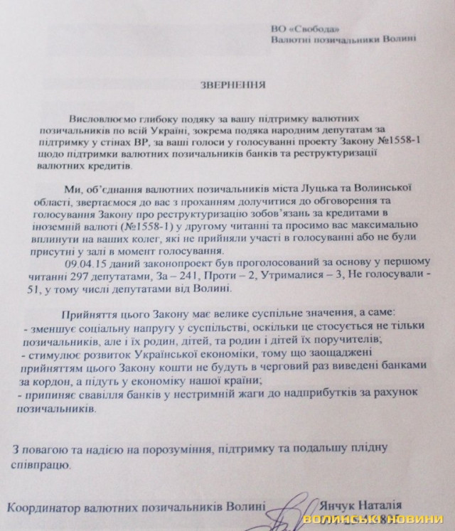 Координатор ГО «Кредитний майдан» на Волині Наталія Янчук зазначила, що окремо аналогічні звернення підготували кожному волинському нардепу, який не голосував за Закон чи був відсутнім у сесійній залі та усім депутатським фракціям.