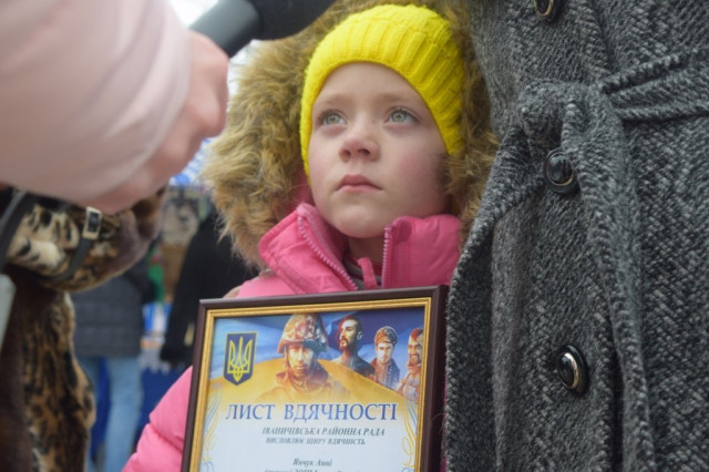 Перед гостями ярмарки виступила донька загиблого в АТО військовослужбовця Валерія Янчука, Аня. Її рідні не стримують сліз – 8-річна дівчинка розуміє важливість таких заходів та приймає в них активну участь.