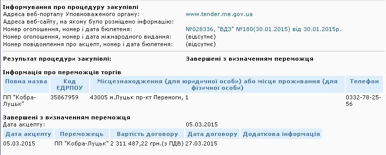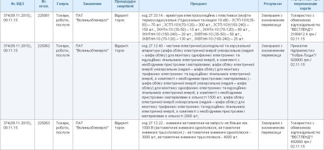 В іншому конкурсі на закупівлю електричної апаратури Волиньобленерго визначило іншого переможця торгів – луцьку фірму «Кобра Луцьк». Тут енергетики закупили електричну розподільчу та клерувальну апаратуру на суму 928 тисяч 800 гривень (код 27.12.40 - частини електричної розподільчої та клерувальної апаратури).