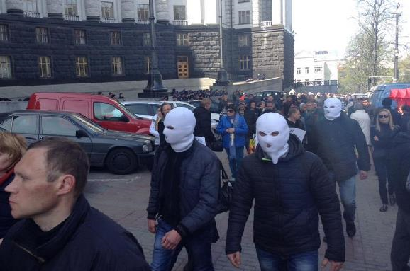 За станом на 14:30 до мітингу шахтарів у центрі Києва долучилися люди в білих балаклавах. Шахтарі з новоприбулою групою підтримки попрямували до Адміністрації президента.