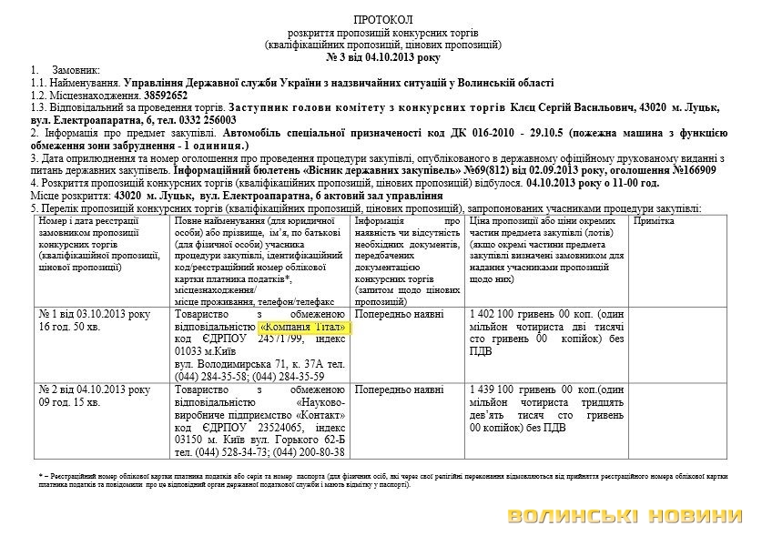 У протоколах розкриття пропозицій конкурсних торгів йдеться, що у тендері для Волині, зокрема на закупівлю пожежної машини з функцією обмеження зони забруднення брали участь дві столичні компанії ТзОВ «Компанія Тітал» та ТзОВ «Науково-виробниче підприємство «Контакт».