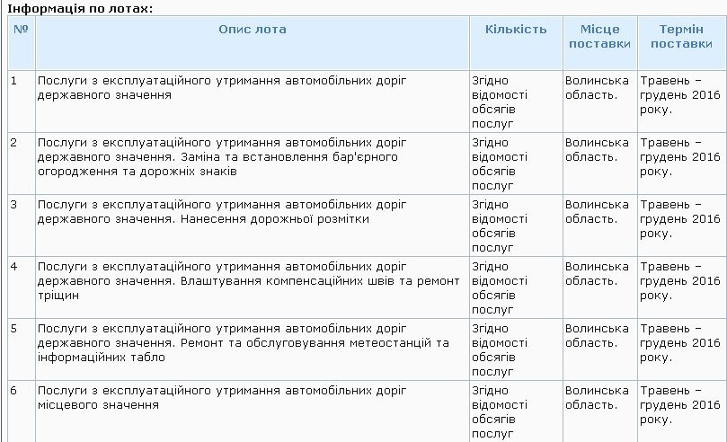 11) ДП «Волинський облавтодор» - лот 2 - 5 933 984,00 грн; лот 6 - 27 272 180,00 грн.; лот 5 - 299 434,00 грн.; лот 1 - 44 430 878,00 грн.