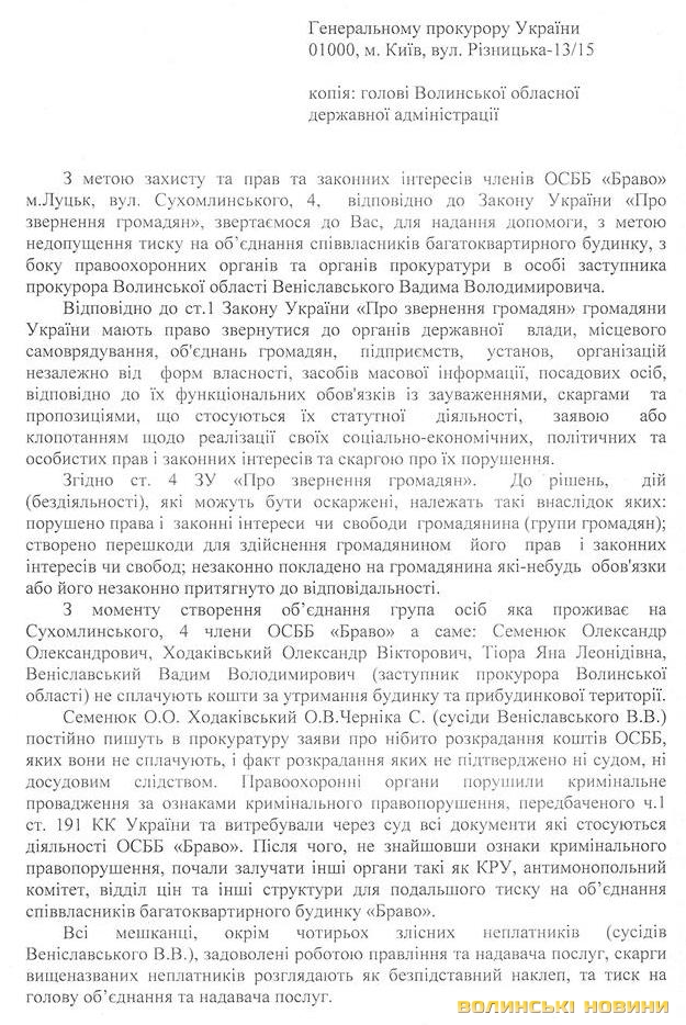 «Громадянин Веніславський В.В. використовує своє службове становище, на протязі 3-х років намагається знищити об’єднання заставляючи своїх підлеглих фабрикувати «липові» справи, задіюючи всі структури Прокуратури та міліції, КРУ, Антимонопольного комітету. При цьому сам не сплачує кошти за комунальні послуги. Просимо захистити права членів об’єднання».