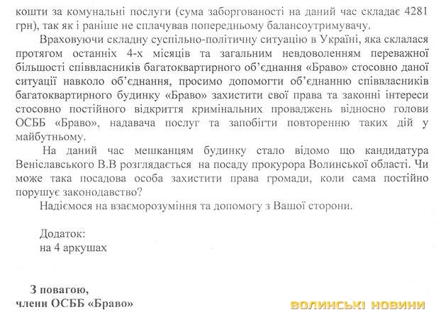 У заяві мешканці наголошують, що своїми діями зазначені боржники погіршують економічне становище ОСББ, що працює на основі повного внутрішньо-господарського розрахунку.«От, як з 2010-го року це почалося, то й досі триває. Нам не платили ці чотири мешканці за утримання будинку, ми їм вислали письмове звернення, тоді проти нас відкрили кримінальну справу. Нас усе перевіряють, а от порушення не можуть знайти. На нас тиснуть, щоб ми не чіпали жителів-неплатників. У заяві від членів ОСББ ми наголошуємо, що така посадова особа як Веніславський не може належно захищати права громади, коли сам постійно порушує законодавство», - говорить голова ОСББ Алла Гудько.