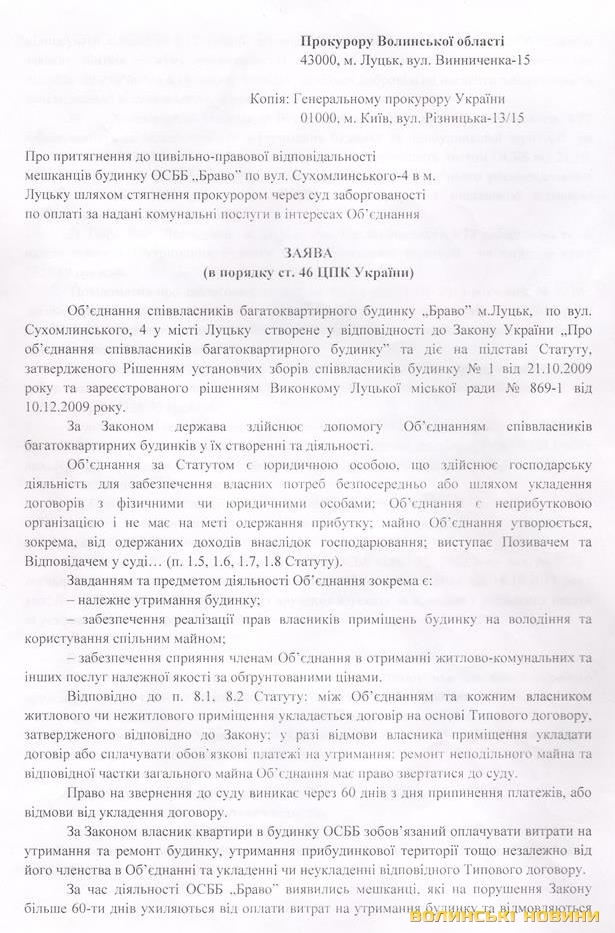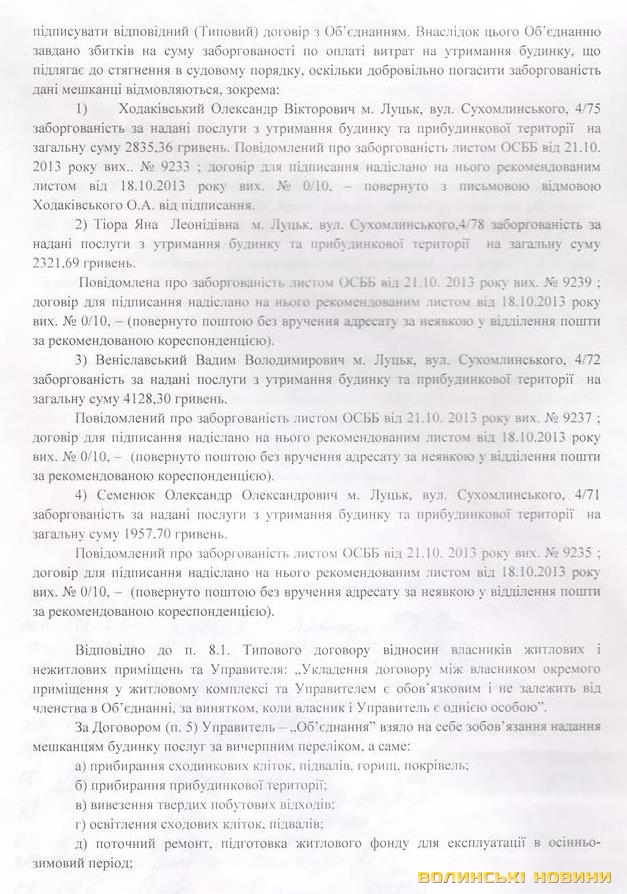 В Інформаційне агентство Волинські Новини надійшла колективна скарга від мешканців Луцького ОСББ, що чотири жителі відмовляються платити за утримання будинку. Натомість один із неплатників, який є працівником обласної прокуратури, робить тиск на об’єднання.