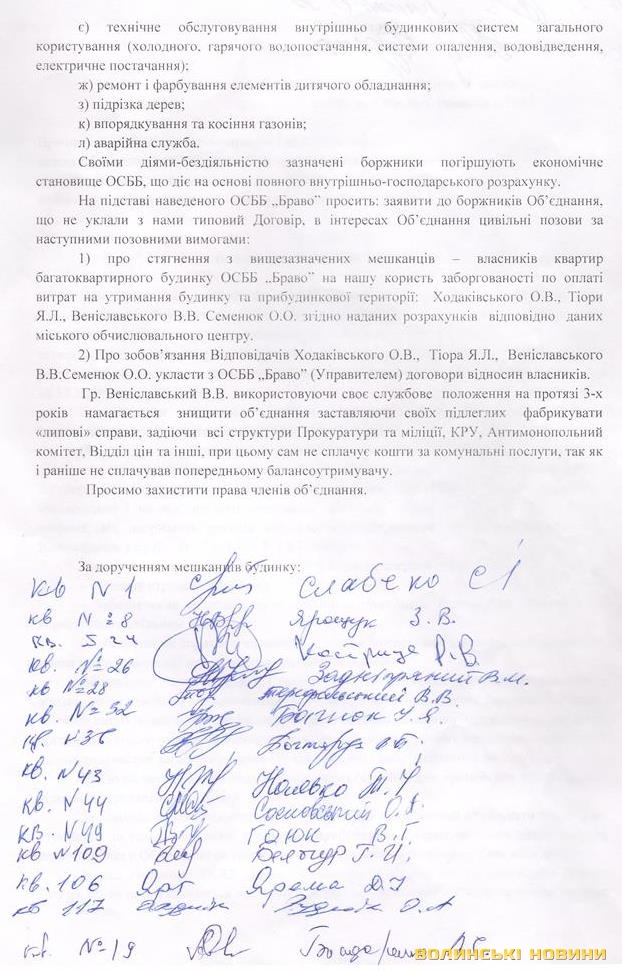 Також мешканці підписалися у листі підтримки діяльності голови правління, ревізійної комісії ОСББ та надавача послуг. Таких підписів 58.Скаргу надіслали голові облдержадміністрації Григорію Пустовіту вчора, 11-го березня. Сьогодні планують звернутися із заявою також до Генерального прокурора України про притягнення до цивільно-правової відповідальності мешканців-боржників будинку ОСББ «Браво» шляхом стягнення прокурором через суд заборгованості по оплаті за надані комунальні послуги в інтересах Об’єднання.