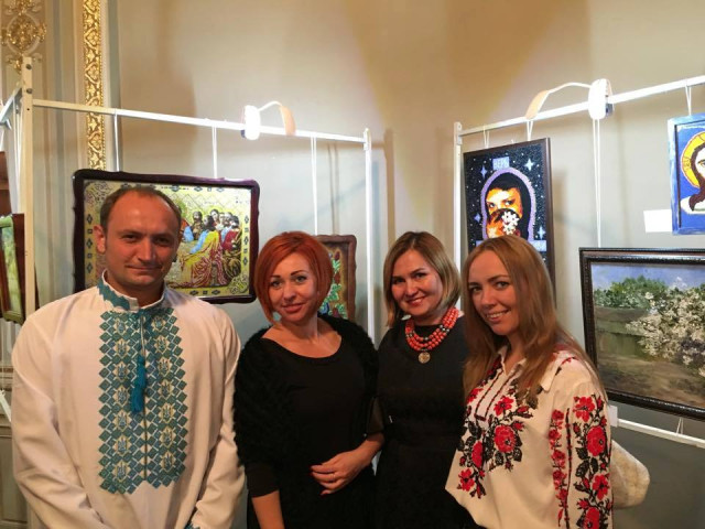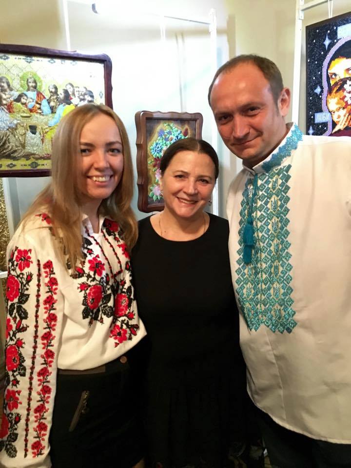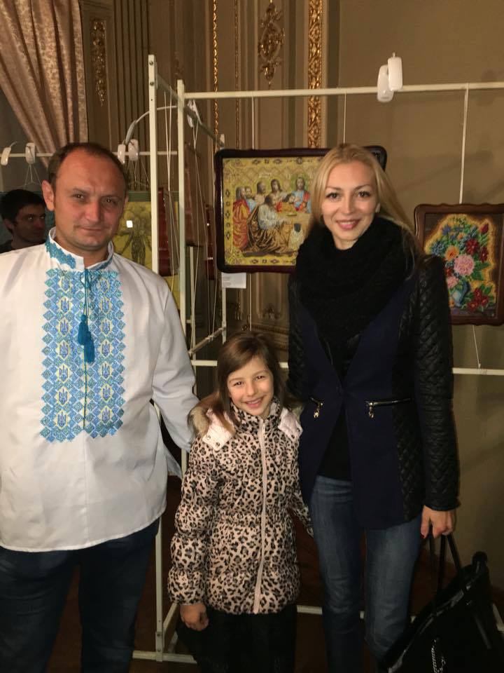 «Дякуємо за запрошення до участі у виставці-аукціоні важкопораненого бійця АТО з Волині Андрія Слюсарчука із його вишитими бісером роботами та доньки загиблого Героя України Оксани Штанської, яка прекрасно малює!Андрій Слюсарчук представив на виставці 6 своїх найкращих робіт, з яких два лоти придбали на аукціоні. Іконку «Святе сімейство» викупили за 3000 гривень, а ікону «Молящая Божа матір» - за 4000 гривень.