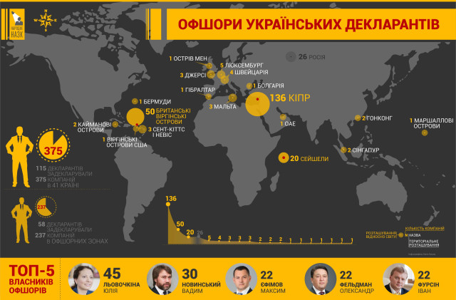 Електронні декларації показали, що майже половина закордонних компаній у власності українських держслужбовців і депутатів - розташована у офшорах. Аналіз усього масиву електронних декларацій проектом "Народне НАЗК" показав - 115 декларантів вказали, що мають у власності компанії за кордоном. Загальна кількість таких компаній – 375 і розташовані вони у 41 країні світу. З них 237 компаній 58 декларантів - в офшорних зонах, - пише bihus.info.