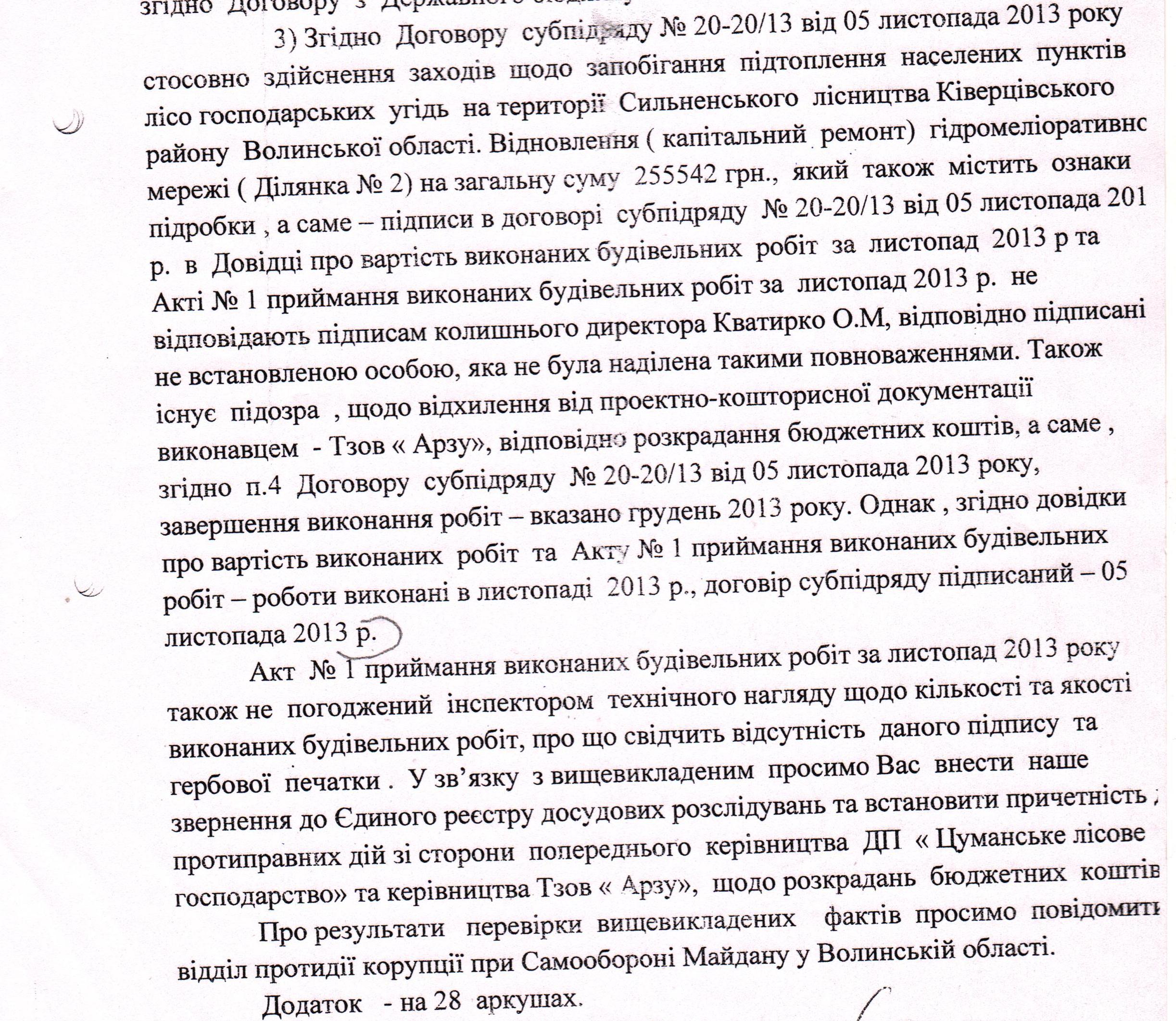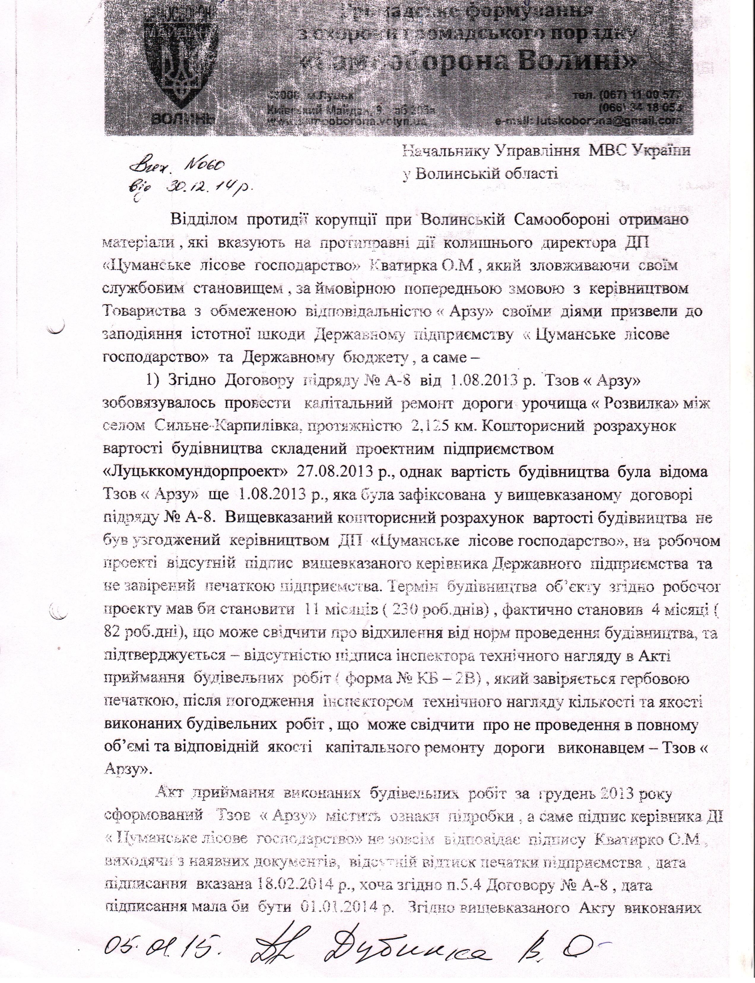 У зв’язку з вищевикладеним «Самоборона» попросила внести це звернення до Єдиного реєстру досудових розслідувань та встановити причетність попереднього керівництва ДП «Цуманське лісове господарство» та керівництва Тзов « Арзу» до розкрадань бюджетних коштів. Лист датований 30 грудня 2014 року.