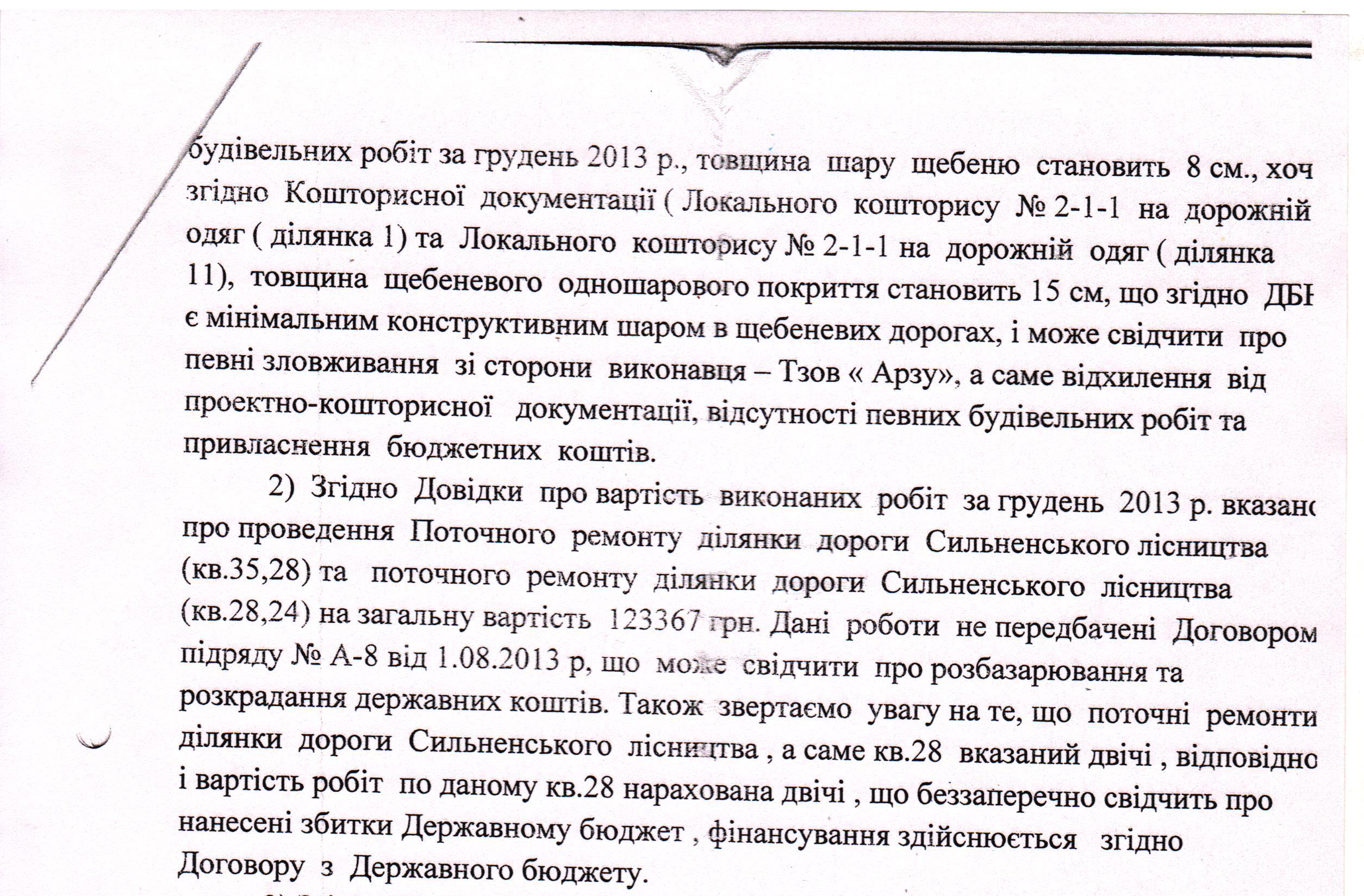 Згідно з Довідкою про вартість виконаних робіт за грудень 2013 року, вказано про проведення Поточного ремонту ділянки дороги Сильненського лісництва (квартали 35,28) та поточного ремонту ділянки дороги Сильненського лісництва (квартали 28,24) на загальну вартість 123367 гривень. Такі роботи не передбачені Договором підряду № А-8 від 1.08.2013 року.