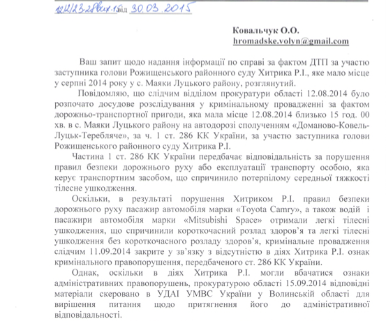 Відповіли. Криміналу у діях судді не знайшли. Матеріали справи спрямували в УДАІ УМВС України в області для вирішення питання щодо притягнення до адміністративної відповідальності. До Вищої кваліфікаційної комісії суддів України скеровано скаргу щодо неналежної поведінки судді з вимогою притягнути його до дисциплінарної відповідальності. Це було ще у вересні 2014. Станом на сьогоднішній день, відповідь на цю скаргу в прокуратуру області так і не надійшла.