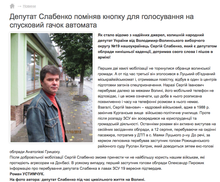 Як це "депутат разом із заступником голови суду скоїли ДТП"? Вони двоє сиділи за кермом? Чого ви до того Слабенка вчепилися? За кермом його не було, сесії в той день не було, на державній роботі він не працює. Ну випив чоловік, ну сів на пасажирське сидіння до заступника голови суду. І що? Чого ви ту фотографію скрізь вивішуєте. А де фото Хитрика, який був за кермом і який причетний до тієї ДТП? Слабо?