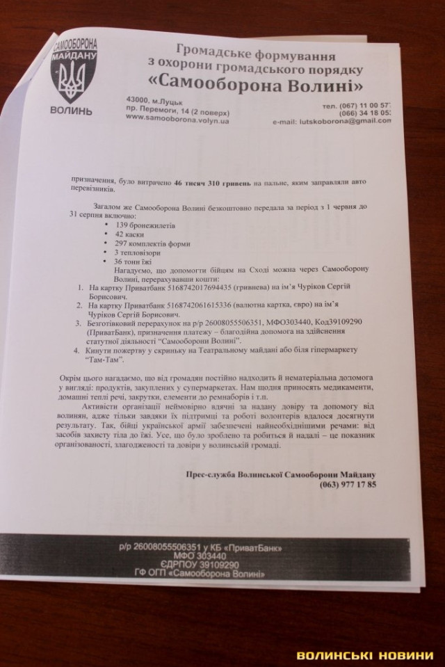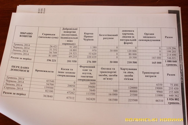 Зі скриньок, які постійно стоять на Театральному майдані та поблизу гіпермаркету «Там Там», протягом травня-серпня зібрали 196 тисяч 221 гривню. Це переважно невеликі пожертви пересічних волинян. У формі добровільних пожертв надійшла 201 тисяча 930 гривень. Окрім цього, на карту фінансового директора Самооборони Сергія Чурікова було нараховано 276 тисяч 389 гривень. На безготівковий рахунок організації у червні перерахували 30 тисяч гривень. З обласного бюджету за посередництвом Самооборони бійцям на Сході перерахували 165 тисяч гривень, з них 70 тисяч - на військову форму та 95 тисяч – на тепловізори.