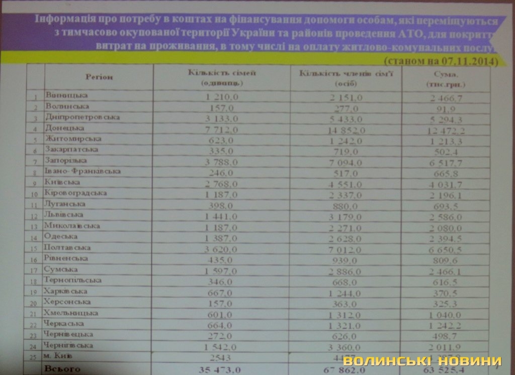 Згідно з інформацією Мінсоцполітики, за станом на 7 листопада, на Волині є потреба у виплаті такої допомоги для 157 сімей в розмірі 91,9 тисячі гривень. До слова, це найменша сума з-поміж регіонів. Найбільшу суму – майже 12,5 мільйона гривень, потребує Донецька область, де, в контрольованих державою районах, звернулися за допомогою 7712 сімей внутрішніх переселенців.