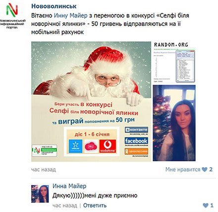 До слова, аналогічний новорічний конкурс серед учасників групи вже завершився. Переможиця «Селфі біля ялинки» у групі Вконтакті - Інна Майер.