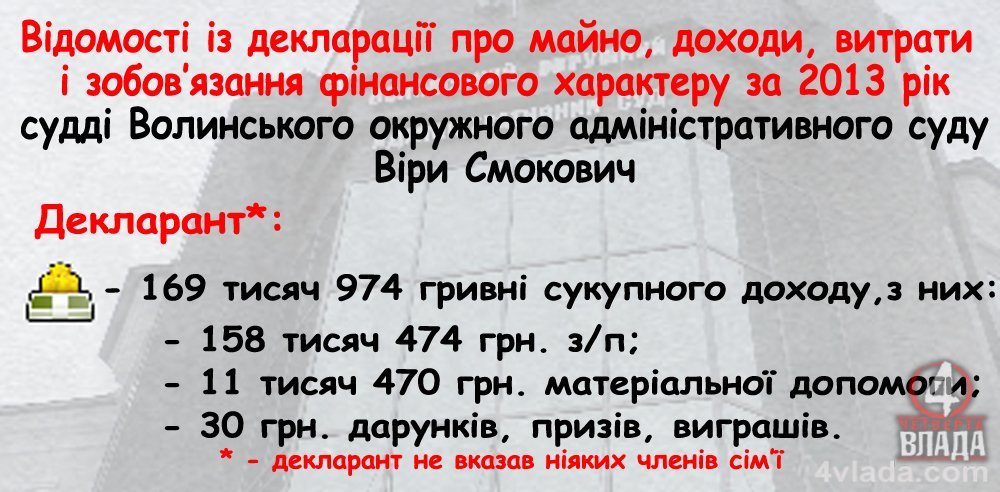 Найскромніша декларація серед суддів Волинського окружного адміністративного суду у Віри Смокович. У документі вона вказала лише свої доходи: 169 тисяч 974 гривні, з яких 11 тисяч 470 гривень склала матеріальна допомога, 30 гривень – дарунки, призи, виграші, а решта – зарплата.